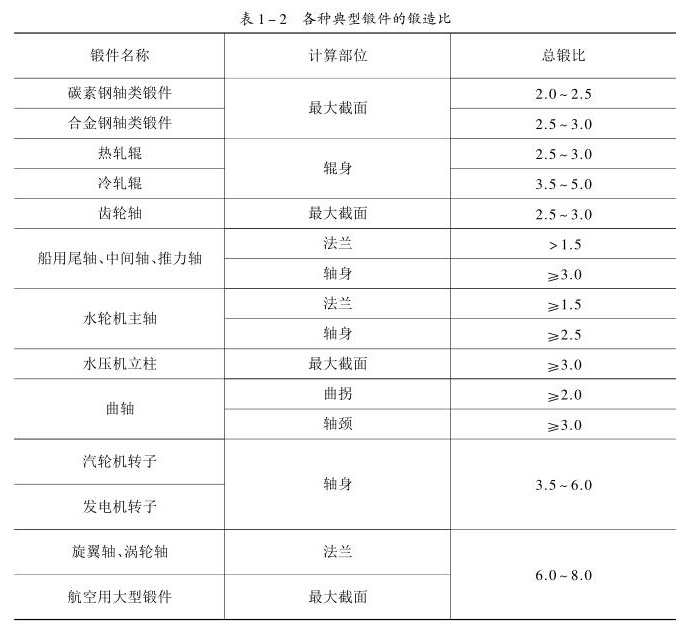 為保證鍛件質(zhì)量,簡化鍛造工序,應(yīng)根據(jù)鍛件的用途適當(dāng)選擇鍛造比的大小,見表1-2。
